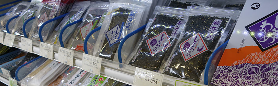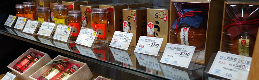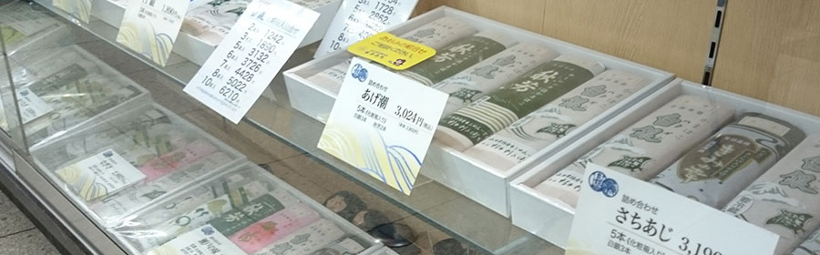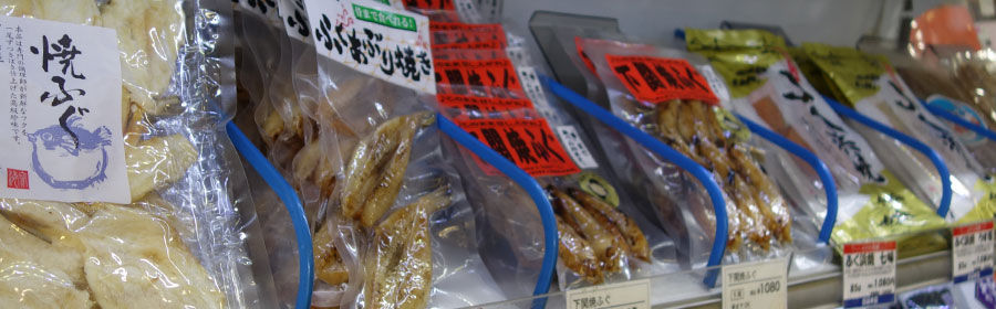 かまぼこ、ちくわ、うに、ふぐ珍味、ふぐ刺(直送)、葉わさび漬、銘菓、ご当地アクセサリ、煙草